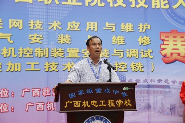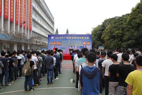 4月12日下午3点,广西机电工程学校承办的2016年全区职业技能竞赛“加工制造类”比赛项目在学校篮球运动场鸣锣开赛,自治区教育厅职成处主任李春鹏、学校校长劳泰伟、副校长苏福业、部分师生代表及兄弟学校的选手和指导老师共200多人参加了开幕式。