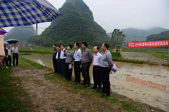 4月7日,黄姚镇民富农机合作社的优质稻种植示范田里机声轰鸣,筑埂机、旋耕机、插秧机来来往往,一片繁忙的春耕景象。这是在昭平县黄姚镇中洞村三排屯召开的贺州市昭平县2016年春季水稻机插秧现场会现场。贺州市农机局潘永锋副局长、市农机推广站、昭平县财政局、农机局和黄姚镇政府有关领导、乡镇农机站负责人、部分农机专业合作社带头人、种粮大户及当地群众等60多人参加。