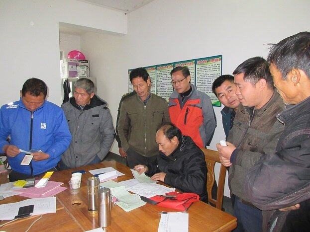 图为黄礼锋局长(左四)查看年检台账的填写情况